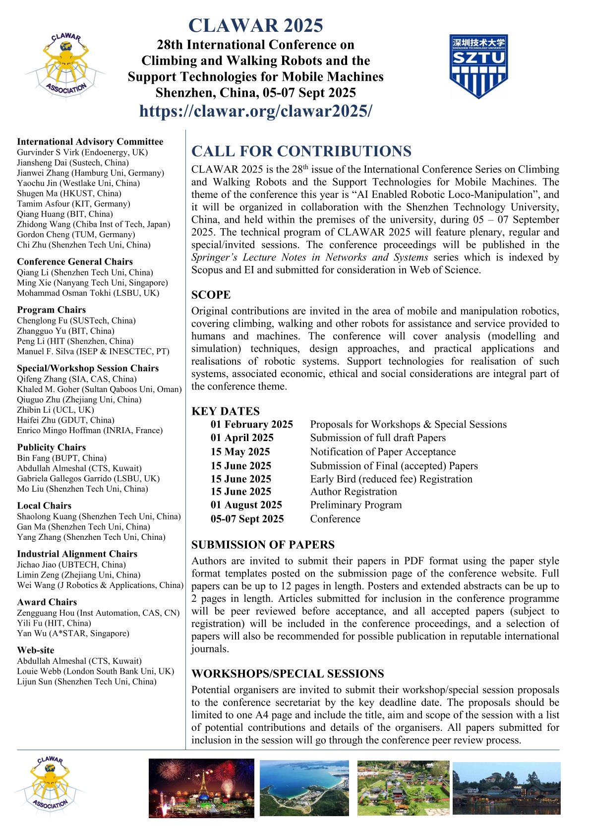 第二十八届国际爬行与行走机器人大会(The 28th International Conference on Climbing and Walking Robots and the Support Technologies for Mobile Machines, CLAWAR 2025)将于2025年9月5日至7日在深圳技术大学举行。本届会议主题为“AI赋能的机器人移动与操作”(AI Enabled Robotic Loco-Manipulation)。